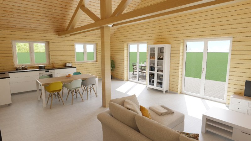 La famille disposera d'une pièce de vie unique pour la cuisine, le séjour et le salon. La charpente traditionnelle de ce modèle permet d'avoir une belle hauteur sous plafond, de type cathédrale, offrant ainsi une sensation d'espace et d'ouverture qui sera renforcée par la présence de nombreuses portes et fenêtres de grande taille.